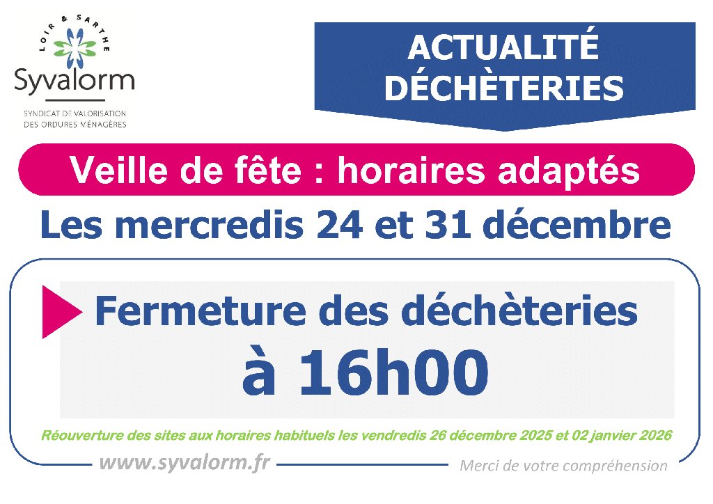 Les déchèteries fermeront à 16h00 le 24 décembre et 31 décembre.