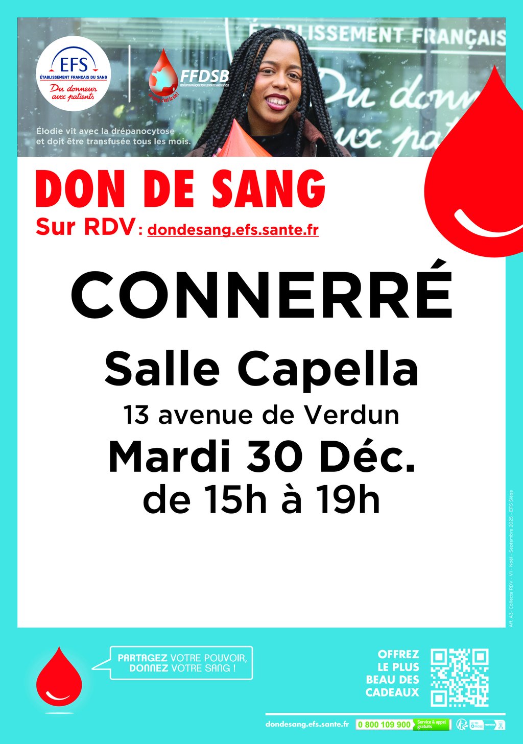 Une collecte de sang est prévue prochainement à Connerré - Salle Capella le mardi 30 décembre 2025.